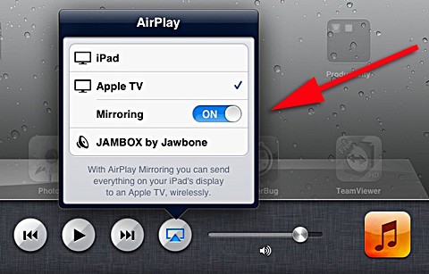You won’t find the controls in the Settings app on your iPad. Instead, they are next to the iPod controls. Double-press the home button on your iPad to see the multitasking bar (the one that shows all your recent apps along the bottom). Swipe to the start of the list and next to the music controls you’ll see the AirPlay icon. Tap on that, select your Apple TV and toggle the mirror button to ‘on’