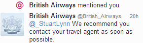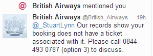 So I do just that and contact my booking agent ‘Trailfinders’ who check everything out from their end and it looks just fine, no problems. I tweet back BA that the booking agent can’t see anything wrong at their end… again BA come back quickly with the even more worrying response of…